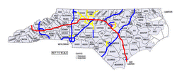 Interstate 40 runs 421 miles (678 km) through the state of North Carolina from the Tennessee state line in the west to its eastern terminus in Wilmington.